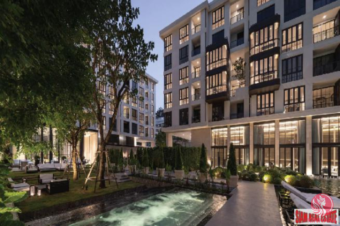 Super luxury condo in green surroundings in dead-end road within easy access to Ekkamai BTS and Thong Lor.