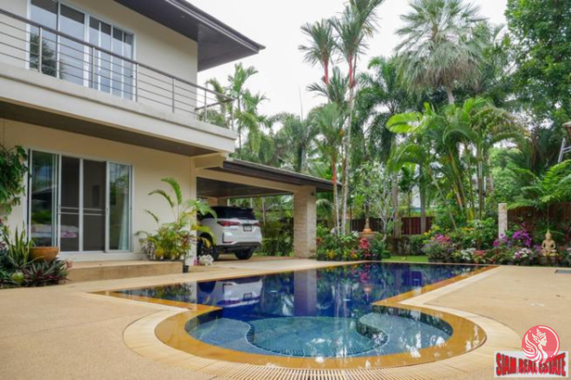 A very private four bedroom garden house for sale in Kathu. The house is surrounded with mature and tropical plants and has a large salt water swimming pool. A high gated forecourt is shared with another house. Within the forecourt is a completely walled garden with 7 high wattage solar lights which automatically switch on as it becomes dark and light up the entire surrounding area.