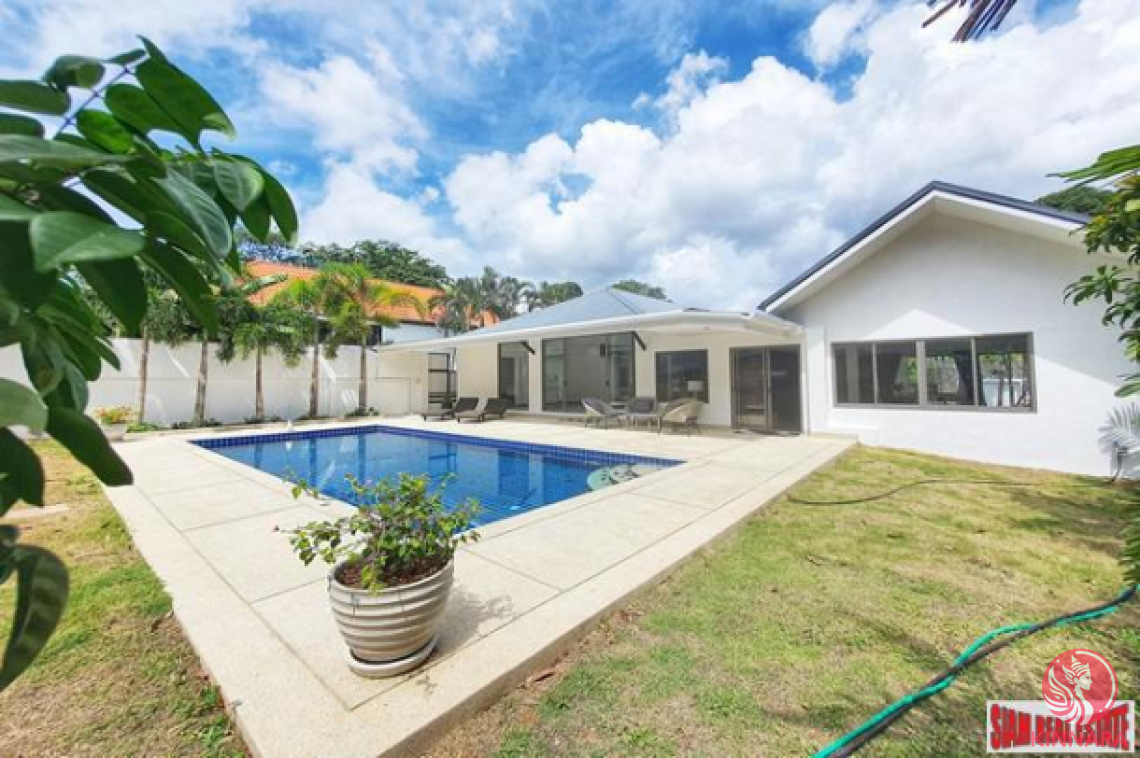 A three bedroom, three bath + guest toilet house for sale. This brand new modern pool villa is situated in the Rawai, only 7 minutes to Rawai Beachfront and 5 minutes to Nai Harn Beach by car or motorbike. The villa features a spacious modern design with large living areas and 65 inch flat screen smart TVs. The full Western kitchen has gorgeous cabinetry and includes a stovetop, oven, microwave, refrigerator, dishwasher, cookware and dishes. This is the perfect place for morning coffee, entertaining or gathering with your family. A more formal dining area sits adjacent to the kitchen.