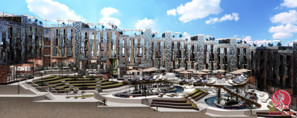 The internal infrastructure includes swimming pools for adults and children, lounge areas, a gym, a conference room, and playgrounds.