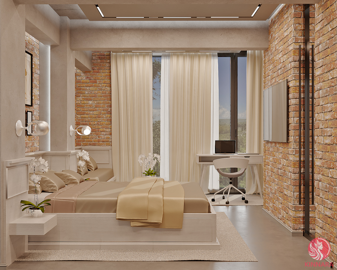 Desain apartemen modern bergaya loft, langit-langit tinggi, dan jendela panoramik dengan pemandangan laut.