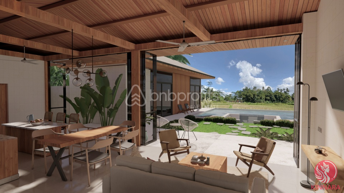 Step into a peaceful paradise with this stunning villa in Ubud, Bali. Starting at USD 262,650, this leasehold property is a rare investment gem in an enchanting locale known for its natural splendor and cultural depth. On an 850 sqm plot, the villa’s efficient 113 sqm design is set to be ready by January 2024. It showcases tropical architecture that merges beautifully with Ubud’s lush landscapes, offering iconic rice field vistas. This two-bedroom, two-bathroom villa comes fully furnished, blending premium comfort with a sleek, modern style. Every detail is crafted to welcome and impress. The enclosed living area combines a well-outfitted kitchen, a dining space, and a lounge that looks out to the scenic outdoors.